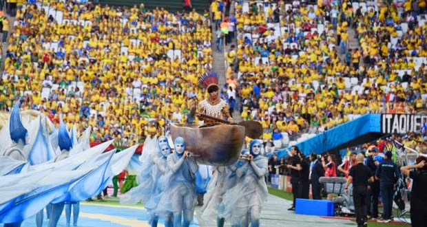 Thousand of fans, including dignitaries watched as a cast of 660 dancers paid tributes to the country’s nature, people and football with a show around a “living” ball on the Arena de Sao Paulo pitch.