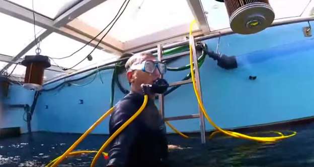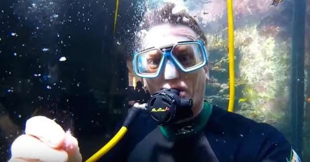 A man has built a giant 30,000 litre aquarium in his living room – which is so big he can get in the water and swim around with the fish .