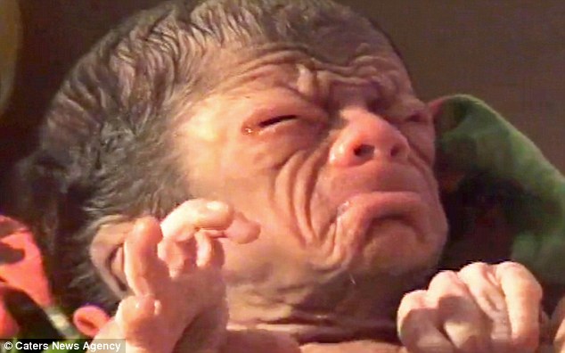 The baby was born with wrinkles on his face, hollow eyes and a shrunken body.