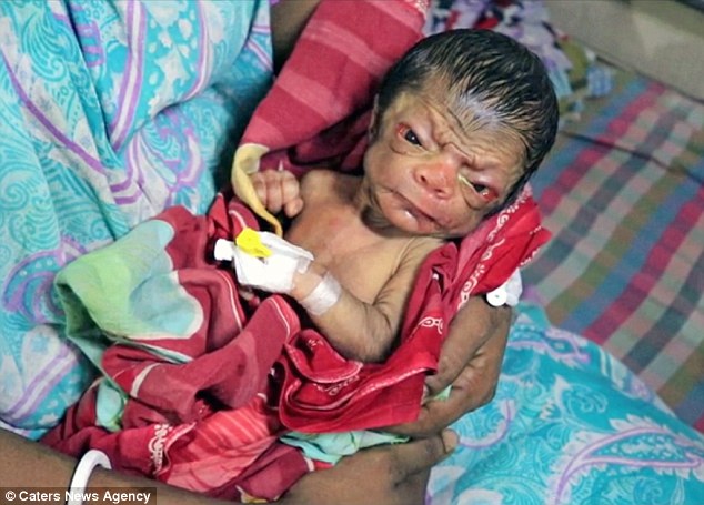 The baby was born with wrinkles on his face, hollow eyes and a shrunken body.