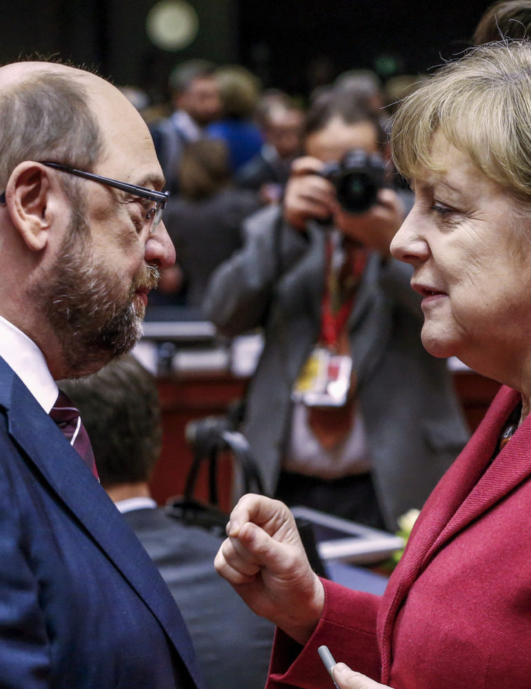 | Former European Parliament President Martin Schulz and German Chancellor Merkel attend a European Union leaders summit in Brussels |