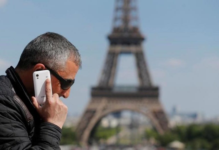 | A man makes a phone call using his mobile phone at the Trocadero Square near the Eiffel Tower in Paris |