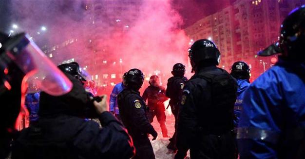 In Bucharest overnight, a small group of football hooligans hurled bottles and firecrackers at police, who responded with tear gas, according to the authorities.