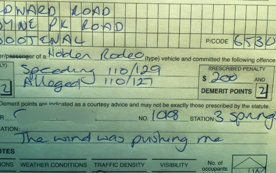 Three Springs Police said that the man, who was not identified, received a fine and points on his license after telling police that the wind pushed his car over the speed limit.