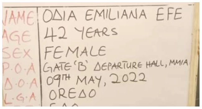At the Lagos airport, a female passenger, Odia Emiliana Efe was arrested on Monday 9th May while trying to board a Royal Air Moroc flight from Lagos via Casablanca to Milan, Italy with 1000 tablets of Tramadol 200mg concealed in food items.
