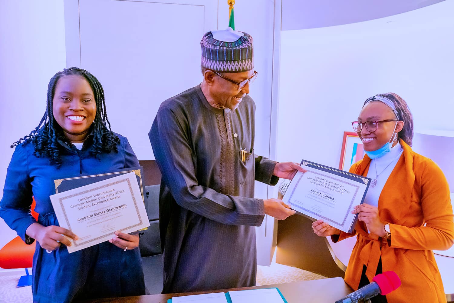 President Buhari receiving a presentation of Shoes made from Recycled Plastic Waste from Yewande Adebowale of Salubata, a Nigerian startup, and Winner of the Commonwealth Youth Competition Award, while meeting with Select Nigerians in Diaspora in Kigali, Rwanda on 25th June 2022