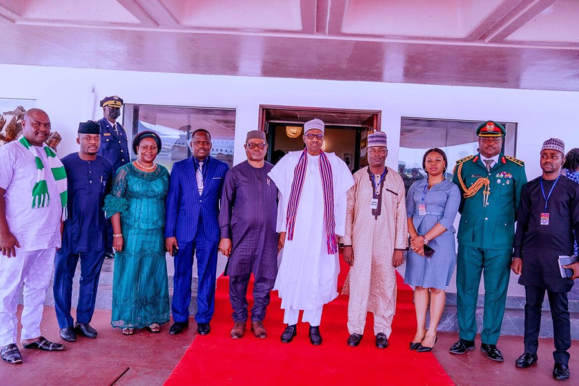 551President Buhari with officials of the Nigerian Embassy in Liberia shortly before departing for Abuja after the 175th Independence Anniversary of Liberia in Monrovia on 26th July 2022
