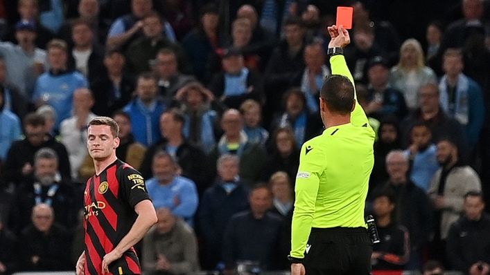 Rodri had a goal disallowed for a handball by Riyad Mahrez, who then had a spot-kick saved by Kamil Grabara before Gomez was dismissed for a professional foul in an eventful first half.